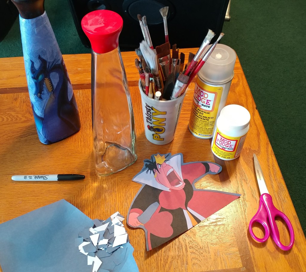 Before anything, clean the bottle well! If not cleaned well, dust or debris will find its way into the mosaic, and when lit up, it WILL show through. First cut out your main image as close to the image edge as possible. Once cut, apply a coat of Mod Podge on the bottle everywhere the image will come into contact. NOTE: Some images will wrap around the entire circumference of the bottle, so make sure you apply enough Mod Podge for the image to adhere to. VERY CAREFULLY wrap the image over the coated area of the bottle, taking care to watch for air bubbles. Depending on the shape of the bottle, you may have to make “flex cuts” in order for the image to lie as flat as possible along tricky curves of the bottle.