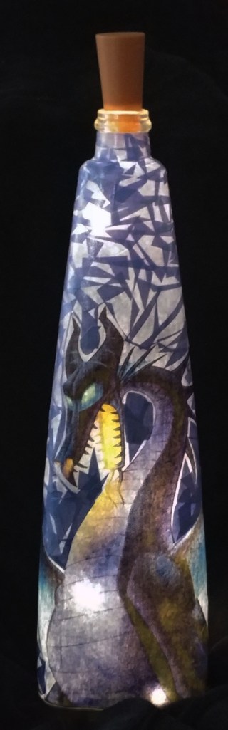 Once the main image on the bottle has “rested”, apply a coat of Mod Podge over it to seal it. Next comes the more time-consuming part… adhering all the small pieces in varied, overlapping textures until the entire bottle is covered. Use the Mod Podge as “glue” as you work, being careful not to saturate too much too soon. Also, be careful of your fingers getting sticky and rubbing off some of the color. Once all the mosaic paper bits are applied, place a complete cover coat of Mod Podge on the entire bottle surface and let rest for at least 2 hours. Afterward, take the bottle outdoors (well-vented) and spray a sealer coat of Mod Podge spray sealant (I use matte, but gloss also works well).